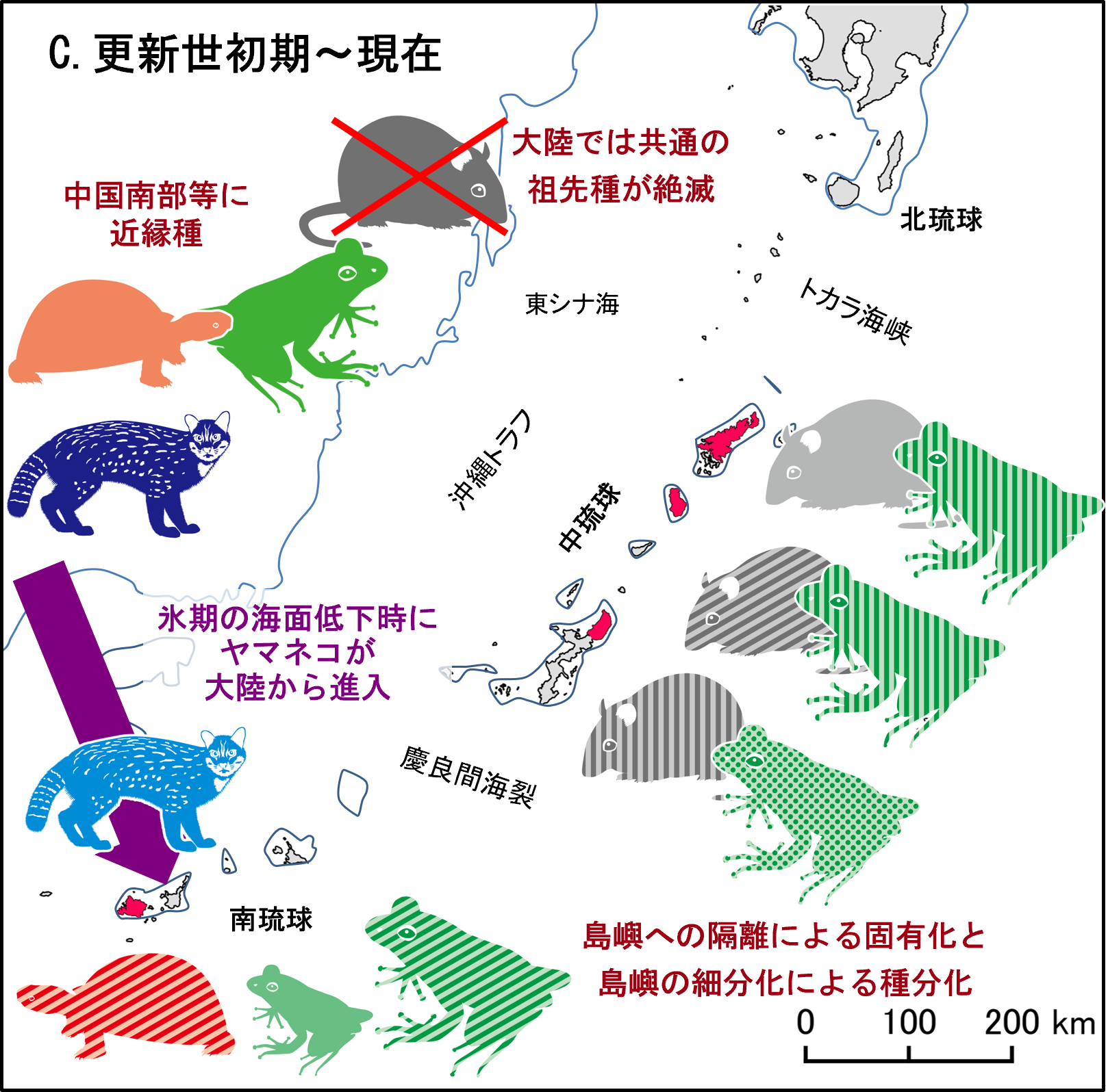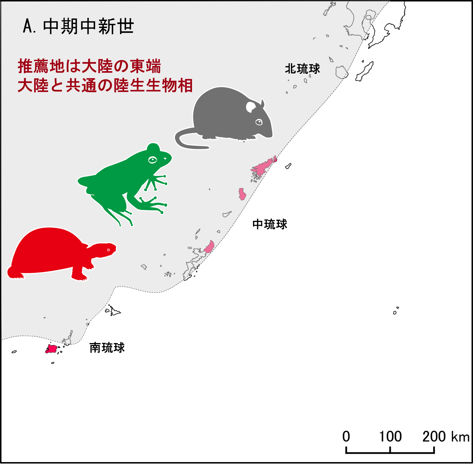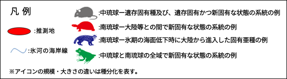 ①大陸では中琉球と共通の祖先種をもつ陸生生物が絶滅してゆき、中琉球は遺存固有な陸生生物相が形成されたと考えられる。(中琉球-遺存固有な系統)