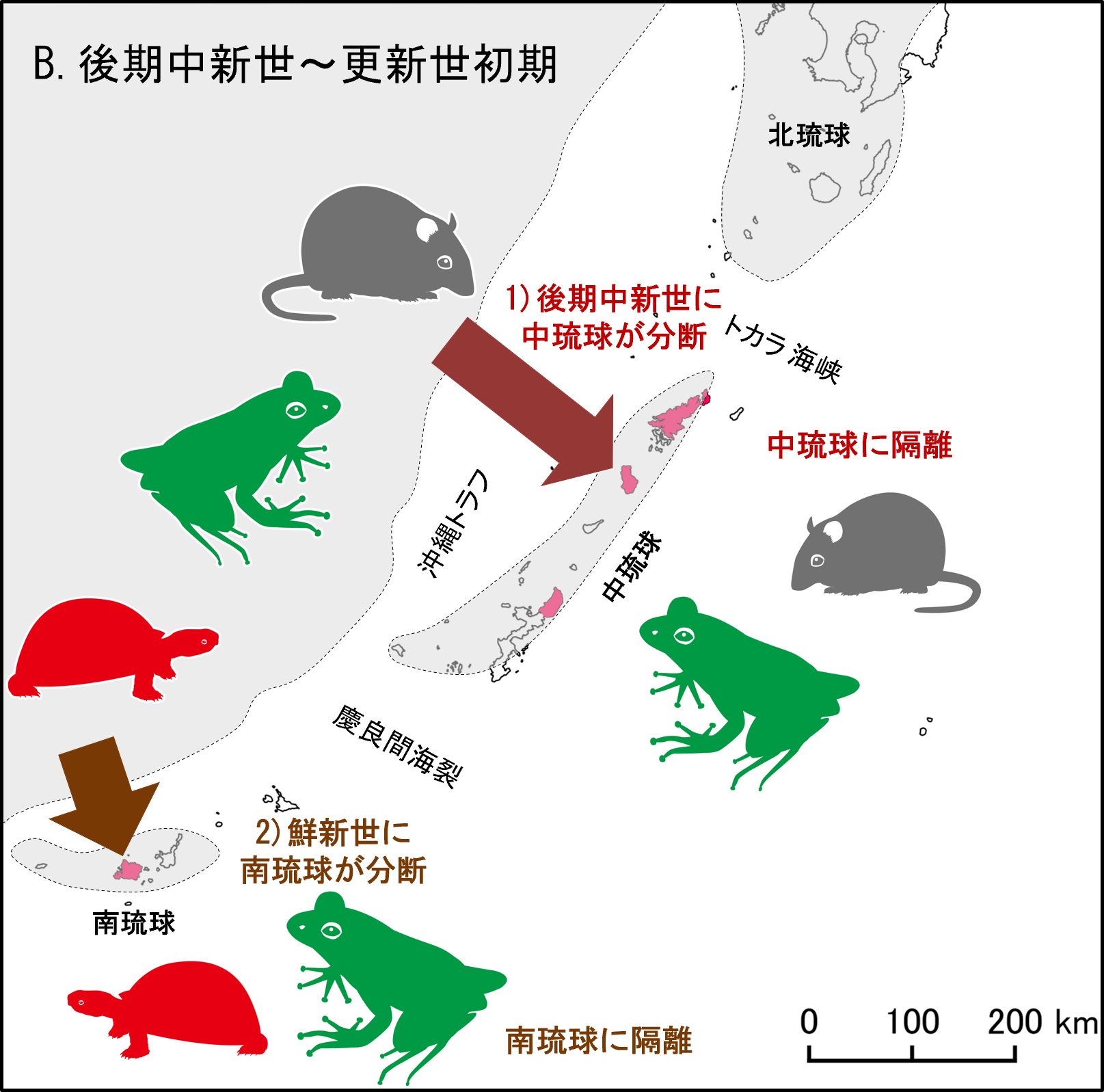 ①沖縄トラフが拡大を開始し、大陸と中琉球、南琉球の間が開き始めた。後期中新世(約1,200万年前〜約500万年前)にはトカラ海峡、慶良間海裂(かいれつ)が形成され、中琉球と周辺の陸域(九州、北琉球や、南琉球)が分断され、中琉球にアマミノクロウサギ、トゲネズミ類、トカゲモドキ類、ハブ、ハナサキガエル類、サワガニ類などの陸生生物相が隔離された。